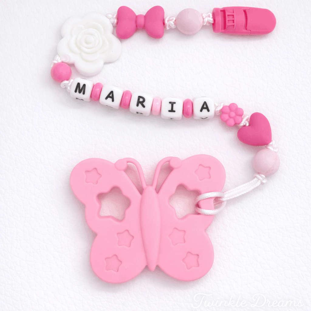 Beautiful colors, handmade in a unique modern design. Extra safe innovative design to insure beads and clip will not come apart. Soft, tactile material for sensory development, gum massage and teething relief. ![]()